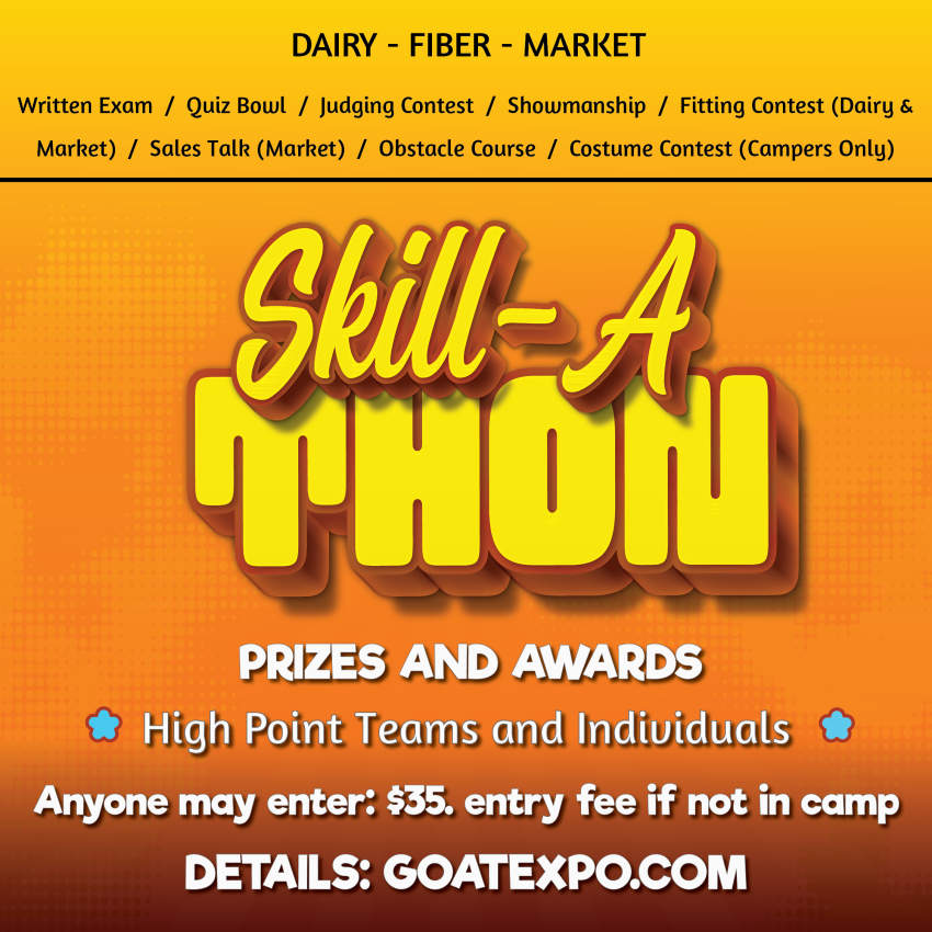 If exhibitor is entered in one of the Youth Goat Camps, there is no additional fee for the Skill-A-Thon. All particpants must enter the Skill-A-Thon by May 24th and declare which one they are entered in: Dairy Market, or Fiber.
