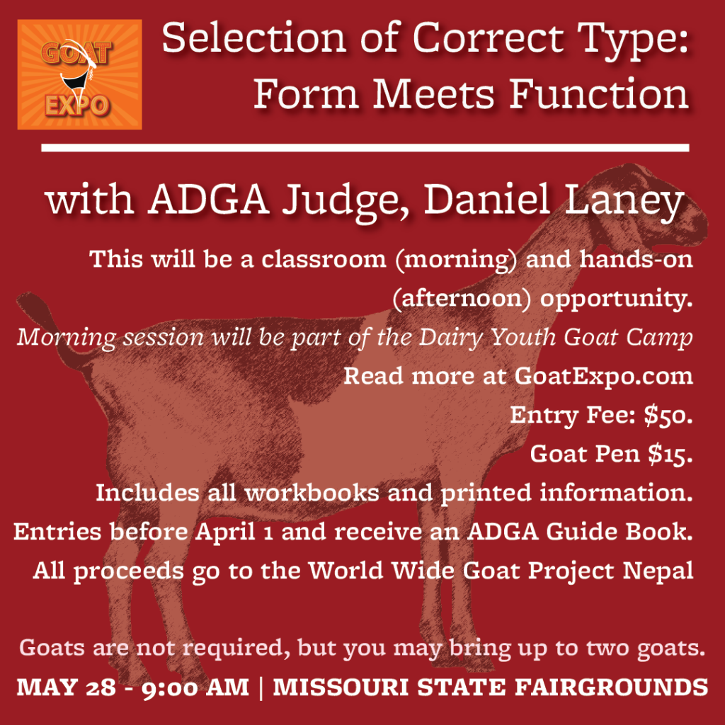 Upcoming event, where you may help: Goat Expo, (Sedalia, Missouri), on May 28th, at 9 am, ADGA judge, Daniel Laney will be teaching a class on Selection of Correct Type: Form Meets Function. CLICK HERE to enter. All proceeds will go to Daniel, so enter today. This is also part of the Dairy Youth Goat Camp Program. Enter your youth today (ages 4-18) CLICK HERE